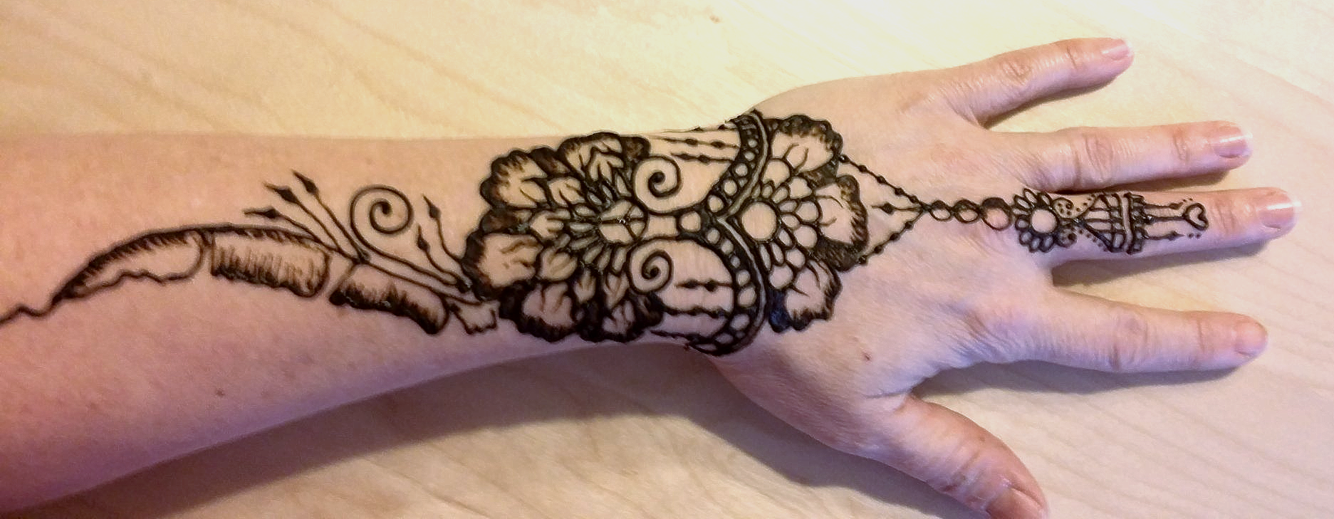 The henna powder is mixed with sugar, lemon juice and essential oils to create a smooth, brown paste, which is then applied to the skin.